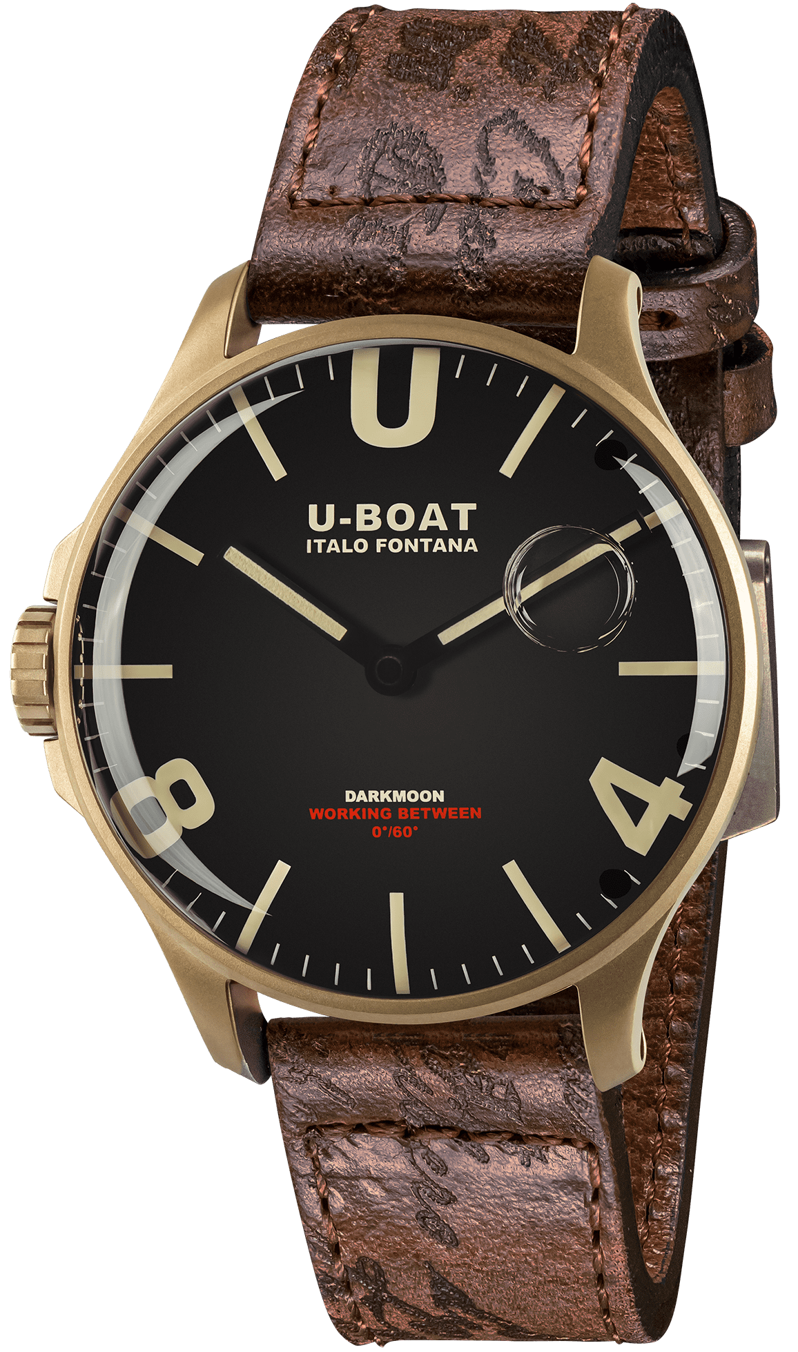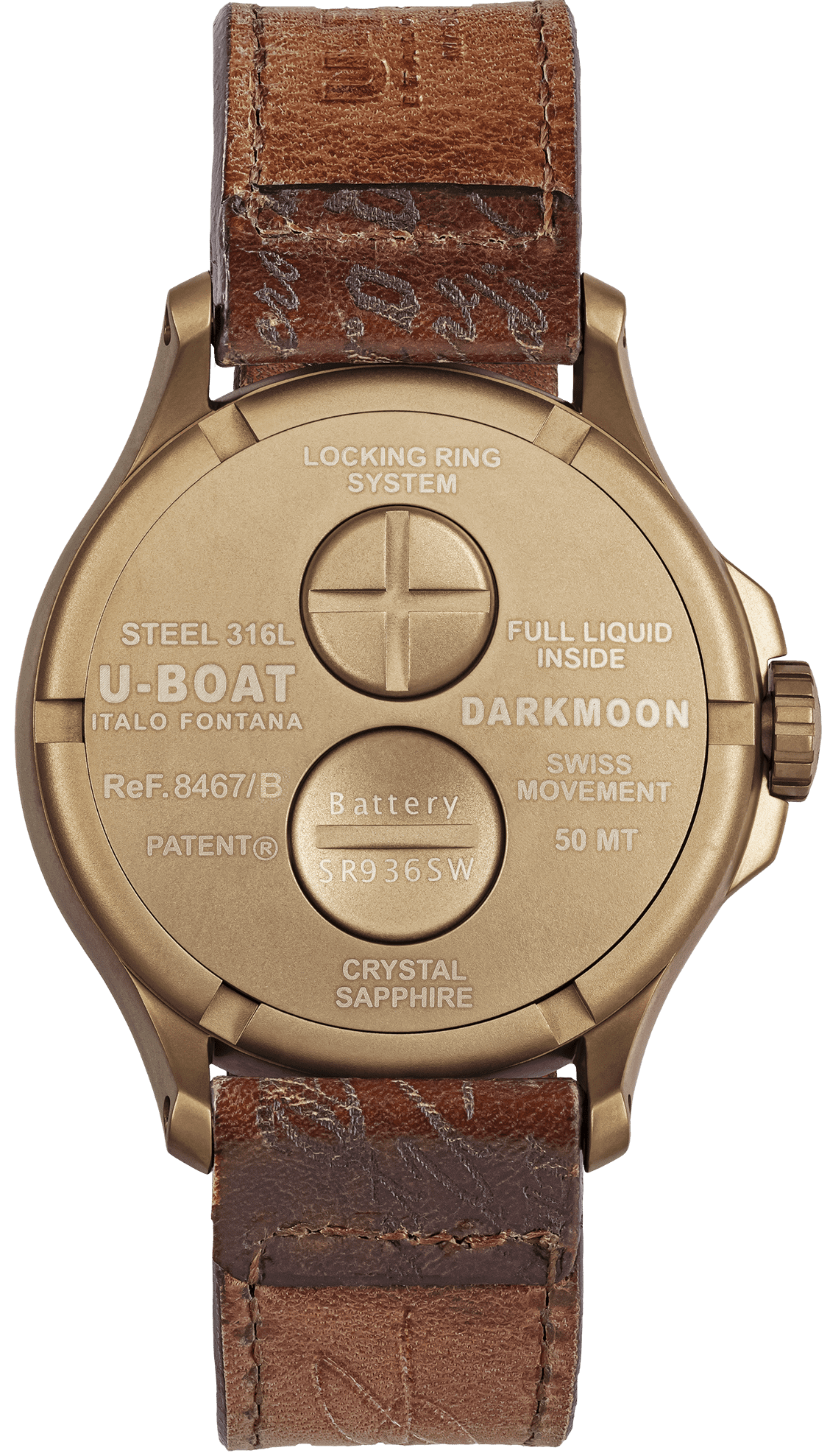 U-Boat Watch Darkmoon 44 Black IP Bronze 8467/B. A collection inspired by the dark side of the moon. The U-Boat watches Darkmoon goes beyond the boundaries of traditional design, combining innovative features with retro style lines. The Swiss electromechanical movement is completely immersed in a low viscosity lubricating oil. The oily liquid flows into the dial making it an absolute and deep black and creates an ever moving compensation bubble that surprisingly amplifies view of the hands that seem to flow free as in the absence of the glass.