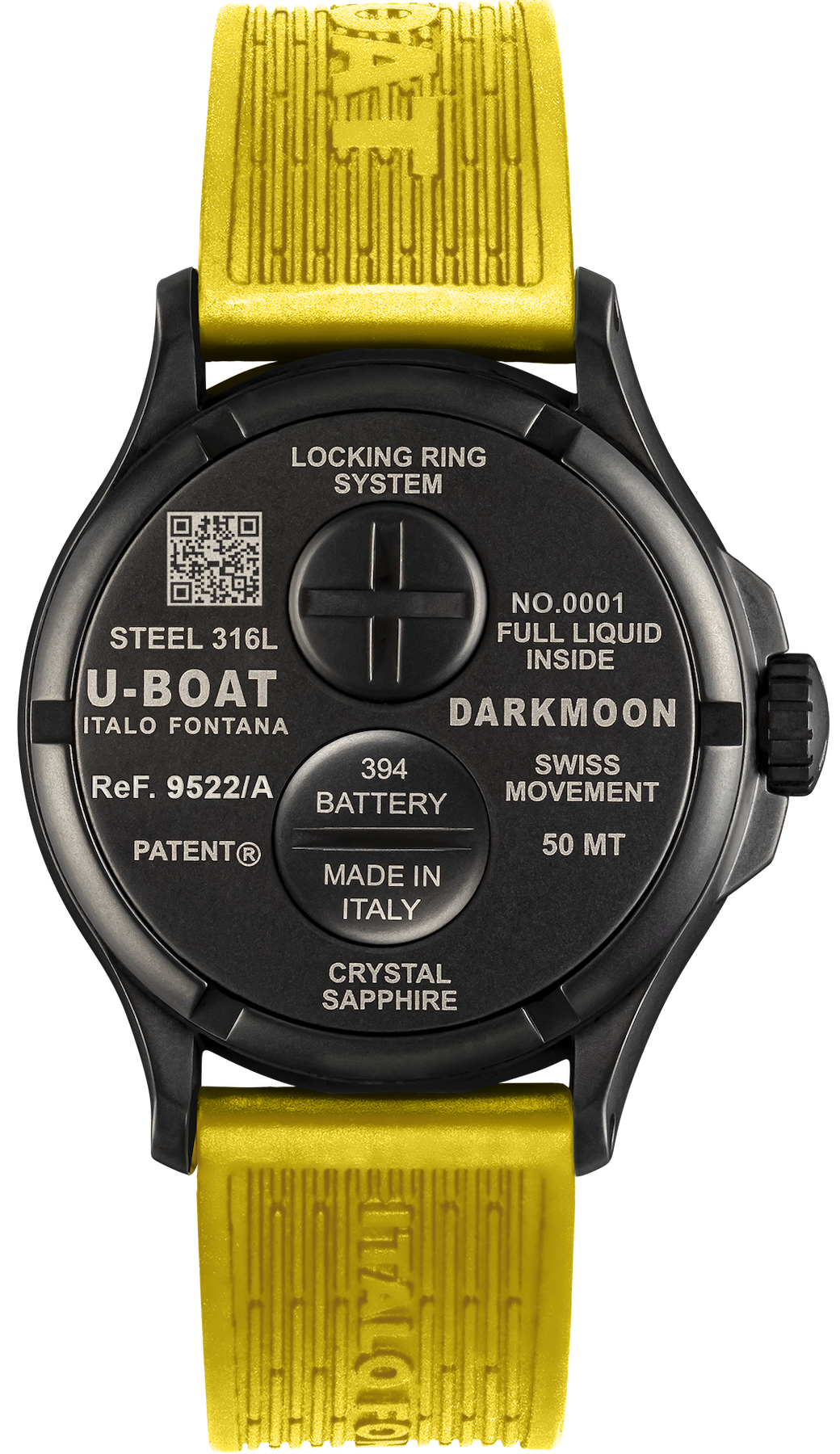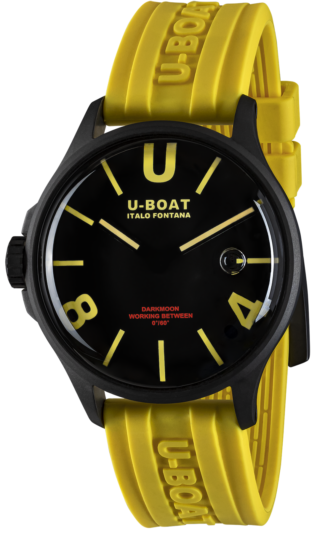 U-Boat Watch Darkmoon 44 Black Yellow Curve PVD 9522/A. The Darkmoon watches feature an electromechanical movement completely immersed in an oil bath, with a compensating bubble, which provides an amplified view of the dial for the wearer as if there were no glass. U-BOAT launches this new range of watches with a new curved dial, under the domed sapphire glass, further emphasizing the 3D effect.
