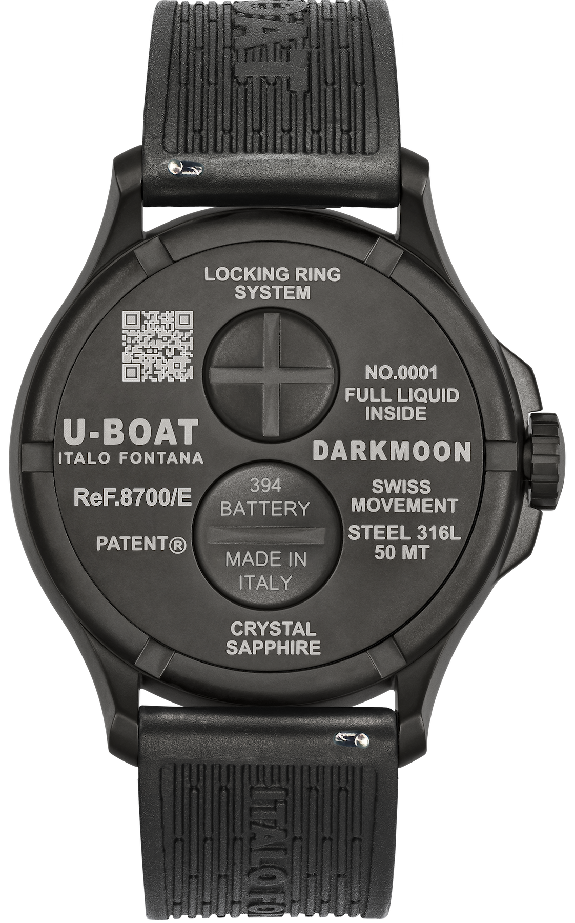 U-Boat Watch Darkmoon Imperial Blue PVD 8700/E. A collection inspired by the dark side of the moon. The U-Boat watches Darkmoon goes beyond the boundaries of traditional design, combining innovative features with retro style lines. The Swiss electromechanical movement is completely immersed in a low viscosity lubricating oil. The oily liquid flows into the dial making it an absolute and deep black and creates an ever moving compensation bubble that surprisingly amplifies view of the hands that seem to flow free as in the absence of the glass. Different shades of dial with Soleil finish. Oil Immersion concept. Innovative system of battery replacement and of Oil Refill.