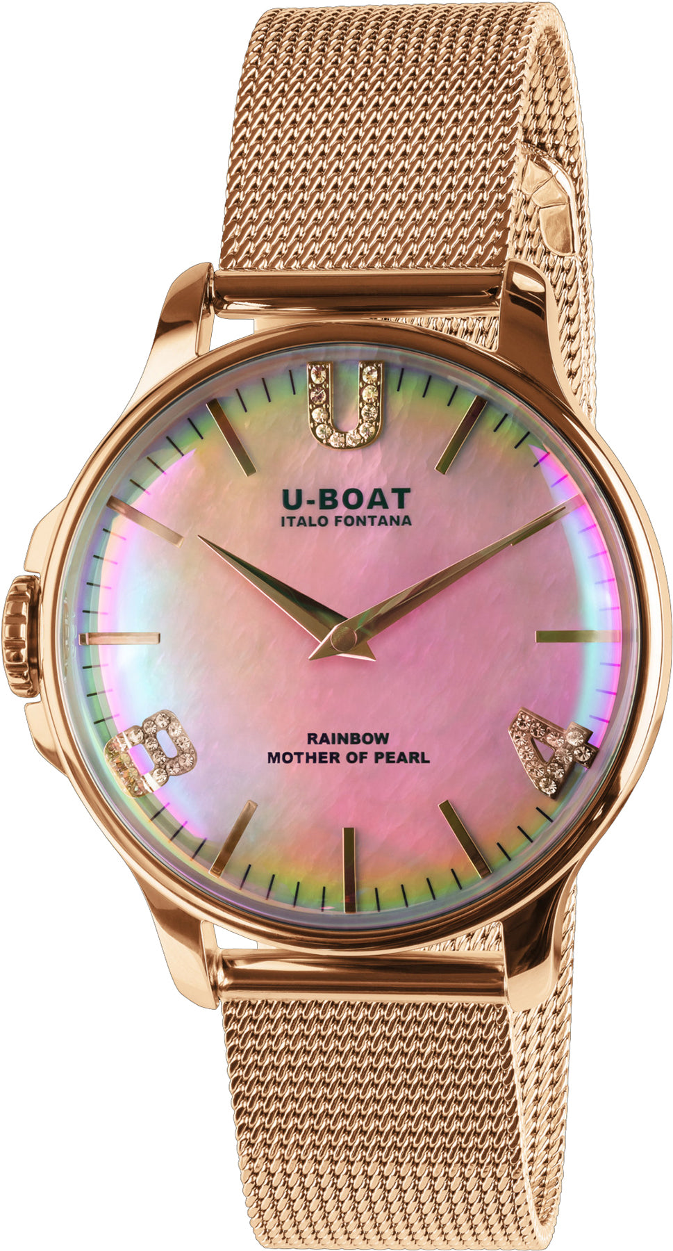 U-Boat Watch Rainbow 38 Pink IPG Bracelet 8473/MT. Watch characterised by a domed iridescent mineral glass creating a rainbow effect and emphasising the different nuances of the pink mother of pearl dial. Designed with in mind a fashion lover person enjoying this world with carefree and colourful approach.