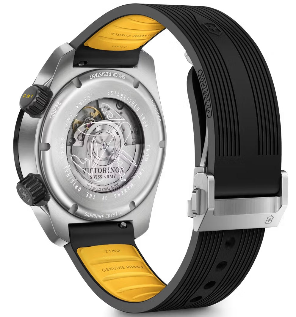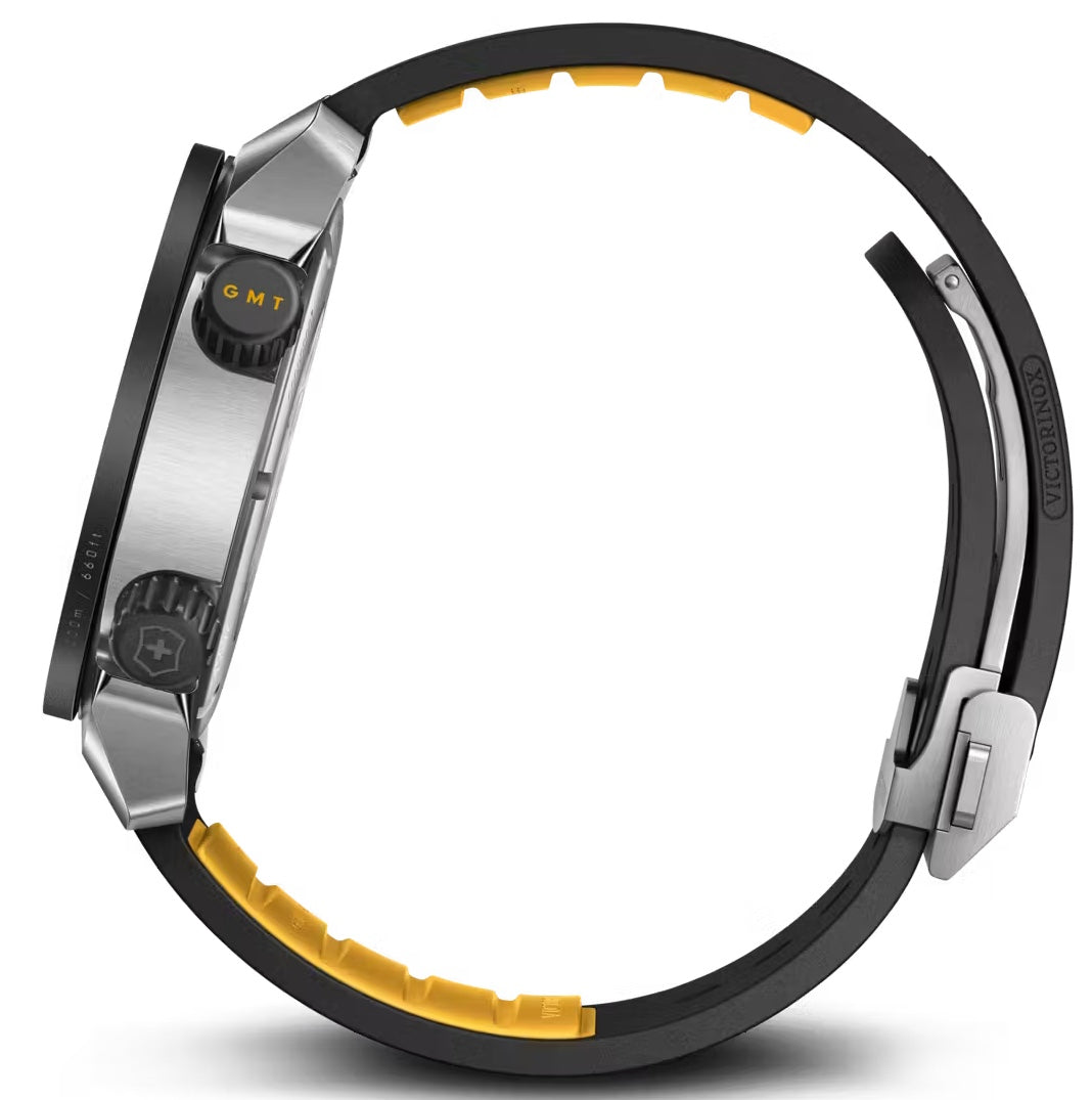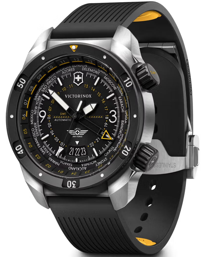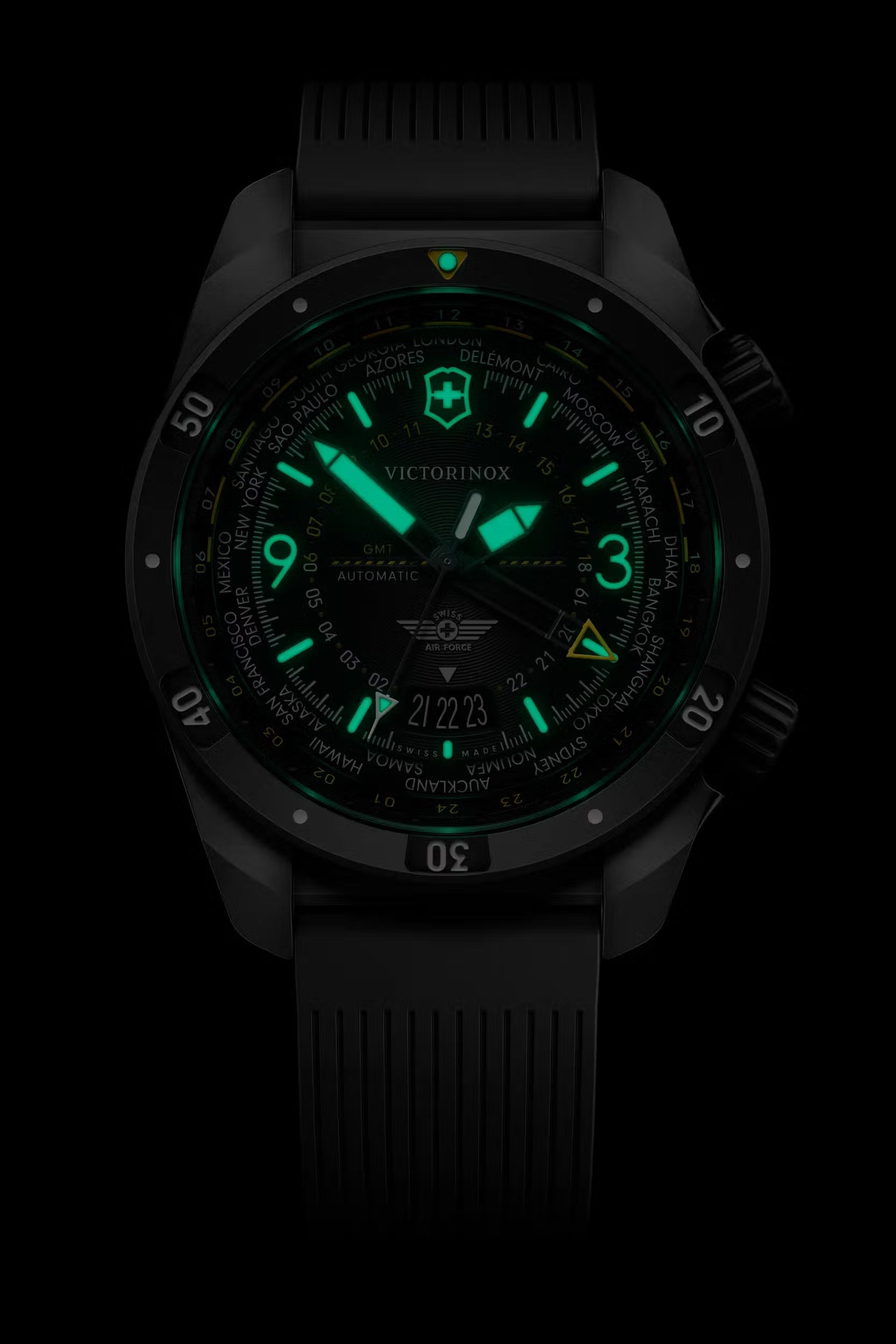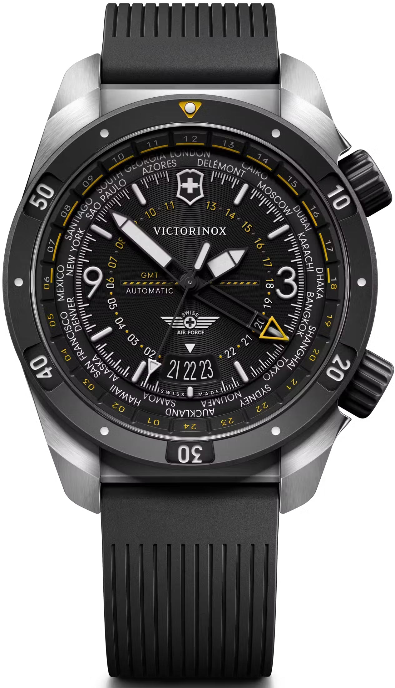 Victorinox Air Pro Automatic Watch 242005. Navigate your day with confidence through superior timekeeping, Swiss design and flight-ready features. The Air Pro Automatic watch blends classic style with advanced engineering for optimal usability. Dual crowns allow precision across 3 time zones, while raised luminescent indexes ensure readability day or night. With ISO shock and water resistance, you're ready for any activity.