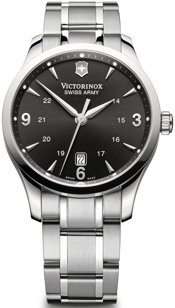 Victorinox Swiss Army Watch Alliance 241474. This beautiful Victorinox watch from the Alliance collection denotes accessible luxury via its sophisticated use of materials, colours and textural designs. The Swiss Army Alliance has an ingenious design and unmatched Swiss quality. The popular Victorinox watches collection adopts a traditionally elegant look using finely chiselled silver hour batons which are interjected with three Arabic numerals at the 3, 6 and 9 o clock locations. A striking date aperture rests at the south of the dial, providing an eye catching contrast against the Victorinox Swiss Army lettering which emanates with confidence from the centre of the face, securing the brands unbeatable reputation for quality. The Victorinox Swiss Army Alliance watch is the strong silent type with a number of understated sophisticated features such as the polished stainless steel bezel and matching solid link bracelet. Victorinox watches have developed this model with 100 metres of water resistance, a 38mm diameter, a solid case back, sapphire crystal glass coating and minute markers around the inner bezel. The hour indexes and hand indices have been coated with a special luminous paint to ensure that the wearer can reference the time in situations where lighting is compromised. The Victorinox Swiss Army Alliance watch operates with a quartz movement and is executed on a beautiful black silky dial.
