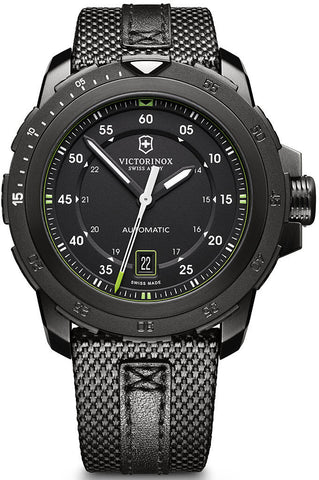 Victorinox Swiss Army Watch Alpnach Mechanical. The masculine Victorinox Swiss Army Alpnach Mechanical model in a bold 44mm diameter offers a sophisticated and highly professional statement via its rugged construction and black nylon strap. The iconic Alpnach collection from Victorinox watches is named after the Alpine helicopter base of the Swiss Air Force. Using Swiss precision and cutting edge design, the Alpnach Mechanical is sharply engineered and directly inspired by the twin-rotor Cougar AS 532, borrowing key elements from the aircrafts rotary blades, cyclic stick, turbines and cockpit. Dressed on a beautiful black hue, the dial features a white seconds hand together with white tipped hour and minute indices for high legibility. A striking date aperture sits at the base of the display, providing remarkable contrast against the lime green painted border and matching minuterie on the flange. Victorinox watches fuse together an excellent selection of materials to create these sound, solid designs that are built to withstand the most extreme of external challenges. Their highly luminous dials provide the wearer with round the clock information regardless of compromised lighting conditions. As well as a water resistance of 100 metres the Victorinox Swiss Army Alpnach Mechanical watch also features a black PVD coated unidirectional rotating bezel, 24 hour markers, luminescent dial appliqu̩s, skeleton caseback and a black PVD coated stainless steel case. Supplier model number 241685