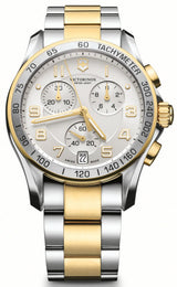 Victorinox Swiss Army Watch Chrono Classic. The reputable Chrono Classic collection represents a selection of true technical classics set inside timeless designs. Embellished with a beautiful tachymeter bezel this gold trimmed stainless steel casing which envelopes a silver dial interacts with a set of gold coated hand and minute indices together with Arabic numerals surrounding the periphery of the dial. A date aperture rests underneath one of the three chronograph sub-dials representing a one tenth of a second, 30 minute and 60 second counters. Victorinox watches choose a triple coated anti reflective and scratch resistant sapphire crystal glass to secure onto the face of the watch, protecting the silver dial from sun damage, water seepage and denting. The Victorinox Swiss Army Chrono Classic watch is also equipped to withstand 100 metres of water depth, making the timepiece a reliable, resilient time keeping tool for all adventures. Additional features of the Victorinox Chrono Classic watch are a double O ring, luminous coated indices and indexes, and a split seconds function. The 41mm quartz operated timepiece is also made from 316L stainless steel. This grade of steel is magnetic resistant and has an extra low carbon content and is extremely resistant to corrosion factors such as seawater and acidic liquids. A bicolour bracelet finishes the timepiece exceptionally. Supplier model number 241509