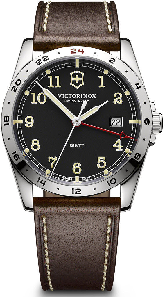 Victorinox Swiss Army Watch Infantry GMT. The beautiful Victorinox Infantry collection exudes versatility. Perfect for an every day wear, a sophisticated evening suit or a work conference, the timepiece blends together exceptional functionality with an incredible style which relies hugely on the simplicity of a military inspired design. Victorinox watches have developed this timekeeper with the enthusiastic traveller in mind because it can radiate both a casual and elegant wrist presence. The Victorinox Swiss Army Infantry GMT watch offers a black dial with the brands signature emergency red hue coating a needle fine seconds hand. A white date aperture sits at three o clock interacting with a contemporary carved set of minute and hour indices together with bold Arabic numerals for the hour markers. The brown leather banded Victorinox Swiss Army Infantry wristwatch is 40mm in diameter and has a 100 meter water resistance, reinforced by its ability to protect the dial face from scratches, denting, sun damage and water seepage via its sapphire crystal glass roof. The Victorinox Infantry GMT watch also features a fixed stainless steel bezel with 24 hour markers, a second timezone and luminescent appliqu̩s. Victorinox watches have developed the GMT function for nomadic enthusiasts so that the wearer can simultaneously read current time and the time in their home country. Supplier model number 241648