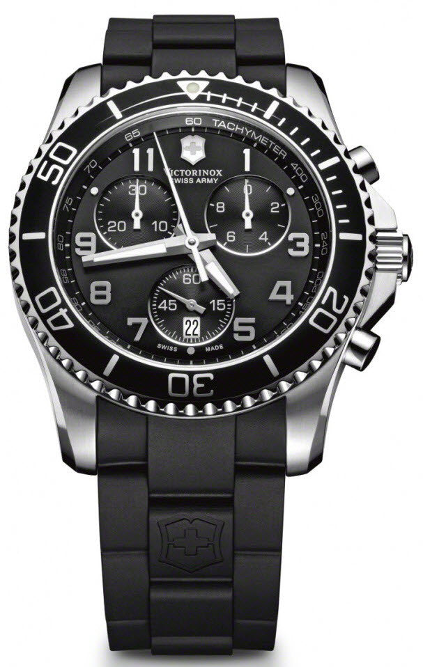 Victorinox Swiss Army Watch Maverick Chronograph. A stunning 43mm chronograph from the masters of the Swiss Army knife. This timepiece features sub dials at the 2, 6 and 10 hour locations encouraging interaction between wearer and watch. Functions can be accessed on this sophisticated device via feather light touches. Underpinned by a strong sense of masculinity, the features incorporated into the design of this Victorinox Swiss Army Maverick watch have been finished to standards of excellence. A stealthy black dial accommodates angular cut hand and minute indices together with sharp Arabic numerals surrounding the outer rim. The elegant silvered appliqu̩s lace the timepiece with elements of luxury. As with all Victorinox watches, the dial as well as the quartz battery are protected underneath a sheet of triple coated sapphire crystal glass. The properties of this material are also anti reflective and scratch resistant to ensure that the Victorinox Maverick watch performs with perfection regardless of external pressures. The timepiece is also water resistant to 100 meters of water depths and is completed on a rugged black rubber strap with tang clasp. Additional features of this Victorinox Maverick watch is a solid stainless caseback, bezel with minute markers and a date window at the south of the dial face dressed against a white background. Supplier model number 241431