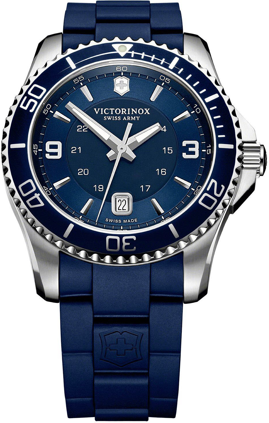 Victorinox Swiss Army Watch Maverick Large 241603. A timepiece which evokes an effortless elegance. The Maverick collection from the globally successful Victorinox Swiss Army watchmakers is a family of watches designed to become reliable daily companions for their wearers. A 43mm deep marine blue dial provide a stark background for a number of alluring assets. The date window showing at the south of the face provides legibility during situations where light is compromised. The chunky and very solid blue PVD coated stainless steel bezel of this Victorinox watch fits in trend with the contemporary chiselled hour and minute hands which have undergone a luminescent treatment, as have the Arabic numerals which decorate the periphery of the dial for the same reasons. Victorinox watches also choose to house the quartz operated timepiece underneath a refined sapphire crystal glass roof, the material has been triple coated to protect the dial against sun and water damage whilst its robust stainless steel bracelet provides a reassuring connection to the wearers skin at all times. Additional features of this beautiful watch include a 100 meter water resistance, a solid stainless steel caseback and a screw in crown. The trusty Maverick device strikes the perfect balance between masculinity and elegance The watch is finished on a blue rubber strap.