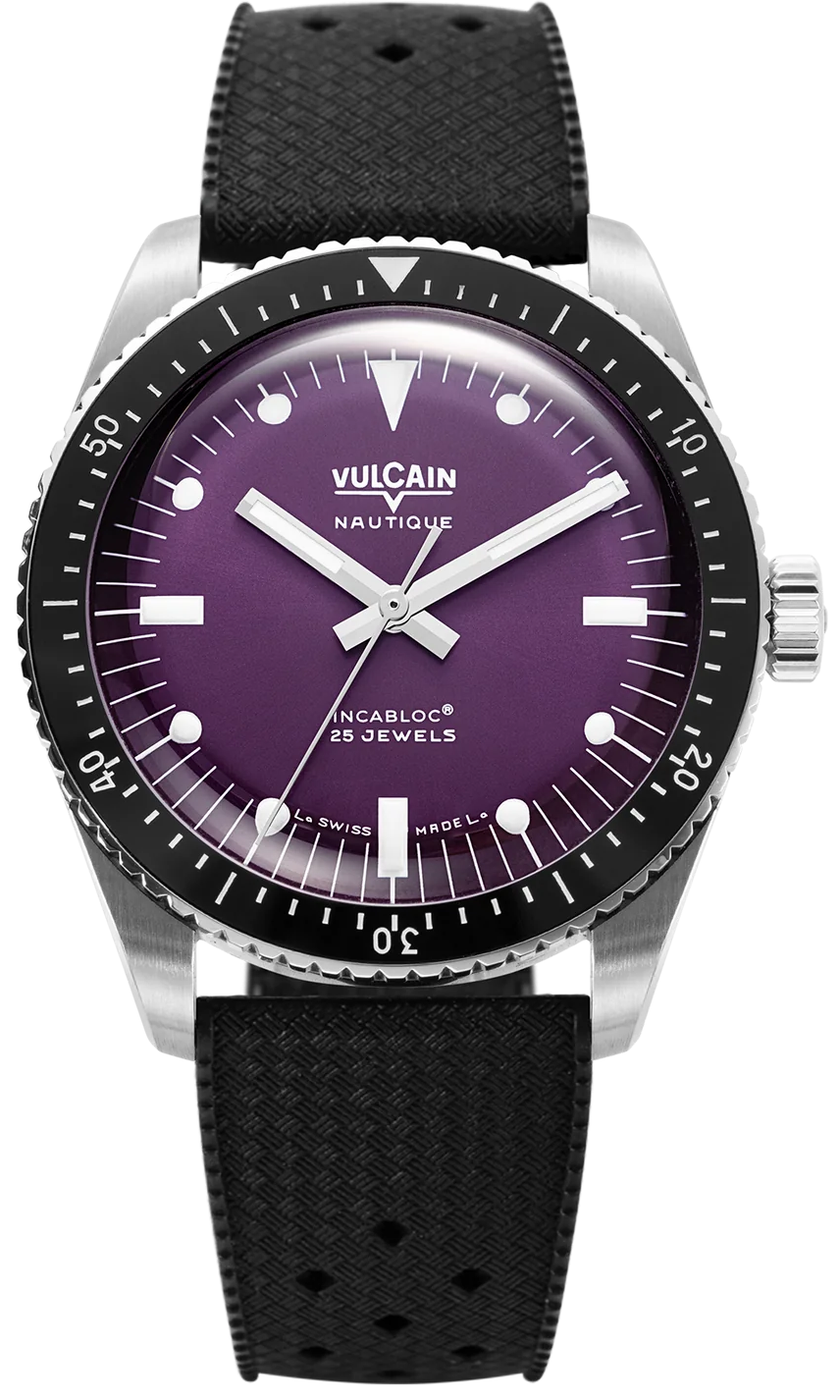 Vulcain Watch Skindiver Nautique Purple Black Rubber Limited Edition 660170A17.BAR200. The Skindiver Nautique has all the attributes of an underwater tool watch, as evidenced by the ultra-legible Super-Luminova-enhanced hands and indexes, which come in khaki brown for an elegant contrast by day and enhanced legibility in low-light conditions, and the unidirectional fluted bezel with black ceramic insert and contrasting white markers. Rated to a depth of 200 meters, the watch is ideally proportioned with a 38mm stainless-steel case.