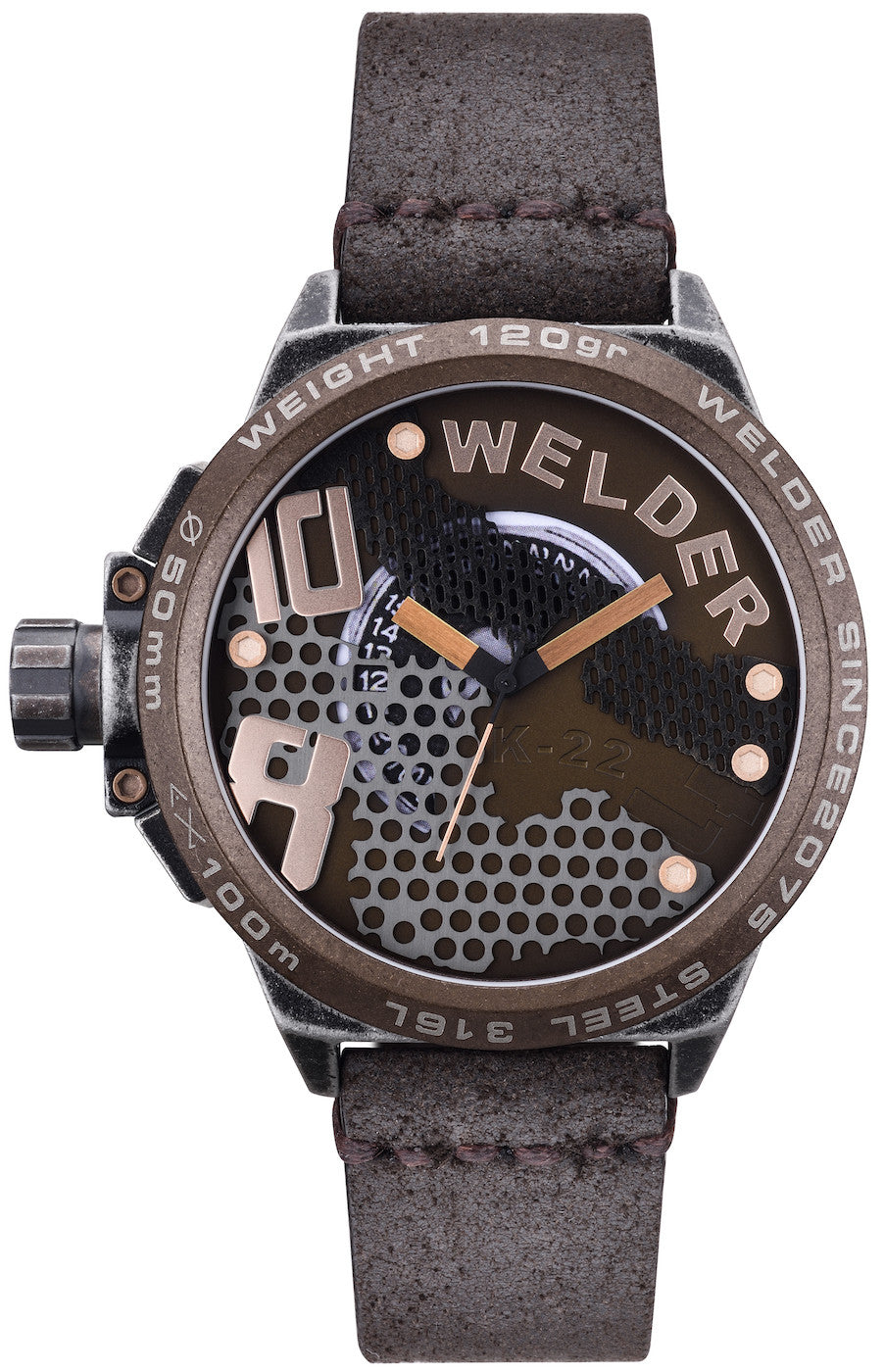 Welder Watch The Bold K22 WRK2205. Jump into the wild, original, ironic, unexploited. Discover the outstanding collection of Welder the Bold. The crown and pushers placed at the left side of the case is the signature of Welder watches and now in this collection it is more attractive.