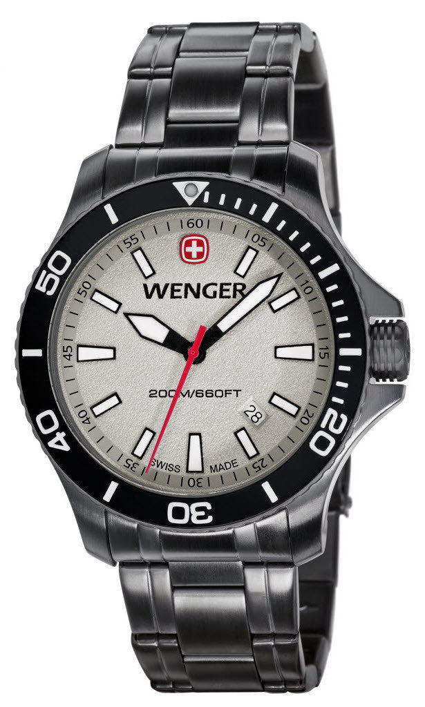 Wenger Watch Sea Force. No environment is more demanding or less forgiving than the sea. Fortunately there's Wenger's Seaforce. Equipped with a knurled, screw down crown which protects the Swiss quartz movement up to 200m, it's ready for service no matter how deep your adventures might take you.