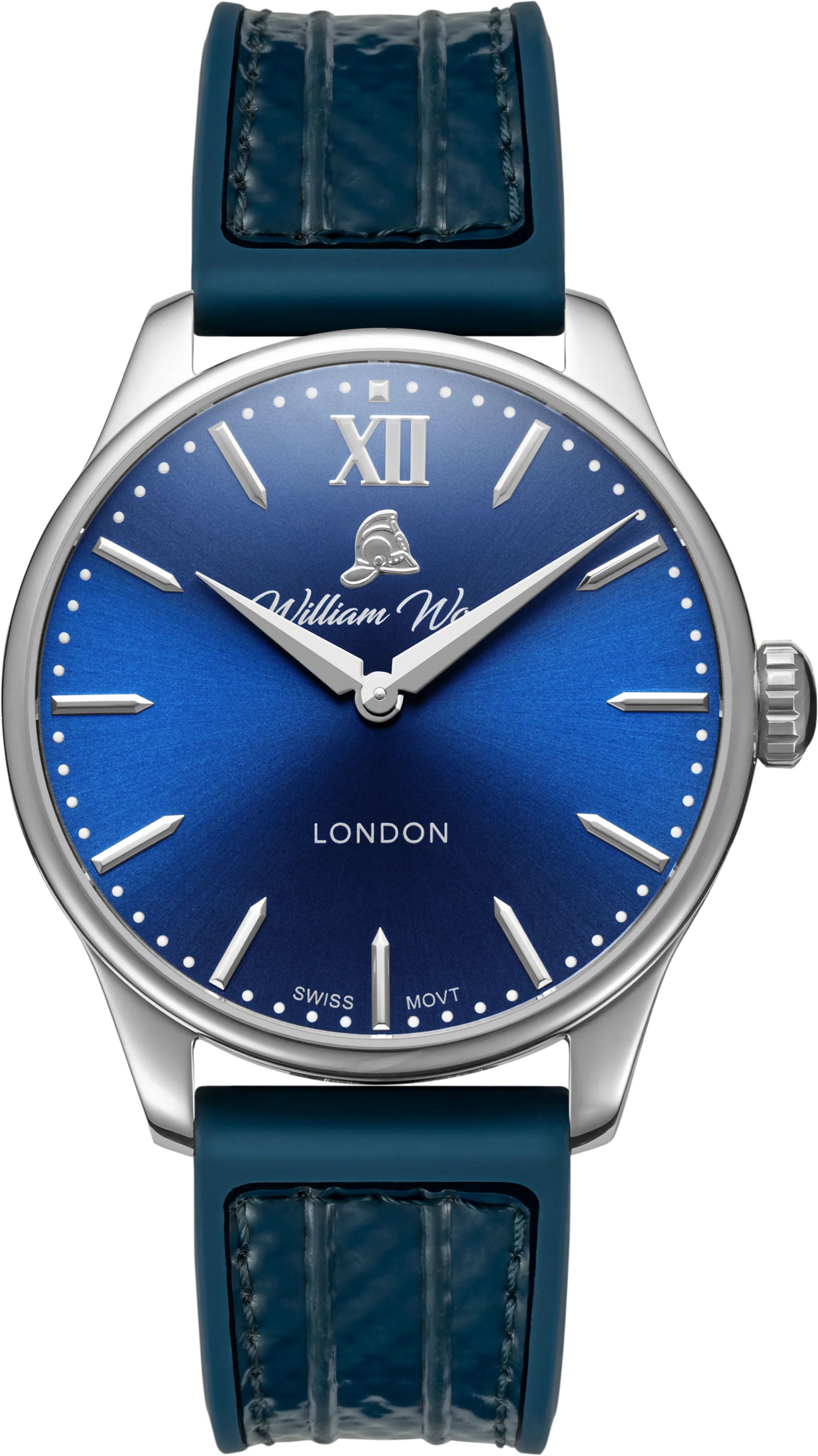 William Wood Chivalrous Midnight Blue Blue Fire Hose Watch. Stainless steel dress watch featuring dauphine hands, chauffeured indices and a commemorative coin caseback made from a 100 year old melted-down British brass firefighter's helmet.