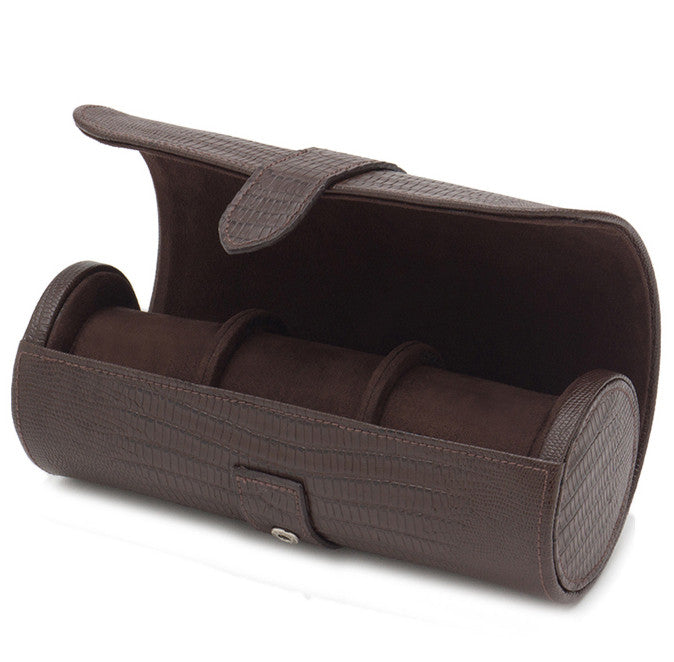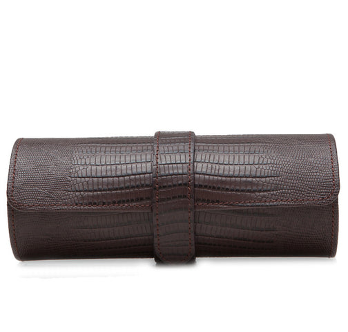 Wolf Blake Watch Roll Brown Lizard 305695. The Blake watch roll, in brown Teju lizard embossed leather, incorporates a classic gentlemans travel necessity with a bit of flair. Includes space for approximately 3 watches with Watch Guards, brown ultrasuede lining and snap closure.