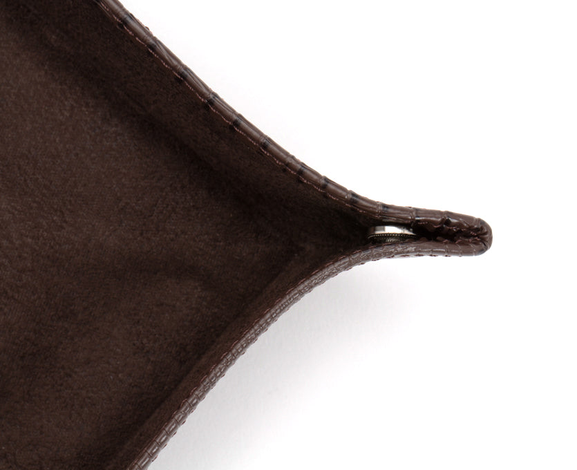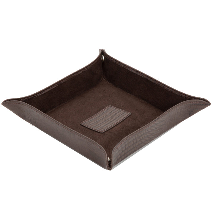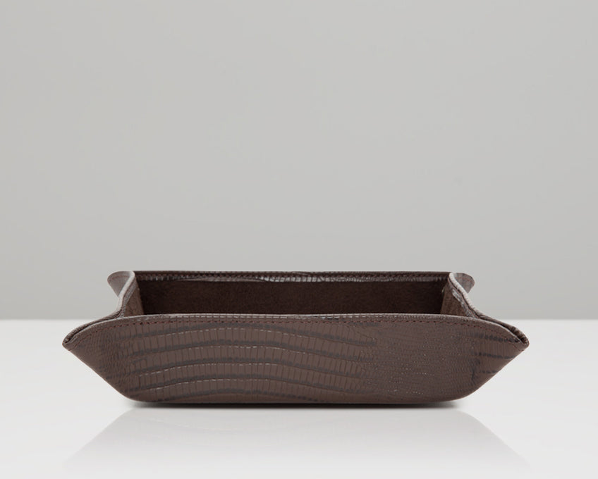 Wolf Coin Tray Blake Brown Teju Lizard 305795. The Blake coin tray, in brown Teju lizard embossed leather, incorporates a classic gentlemans necessity office or bedroom with a bit of flair. Includes brown ultrasuede lining and snap closure.
