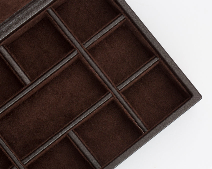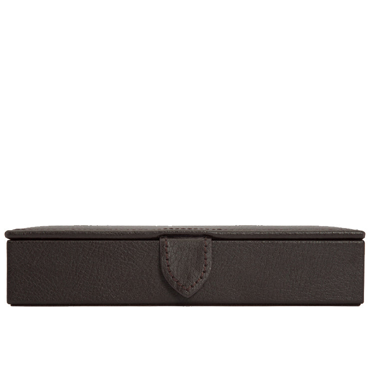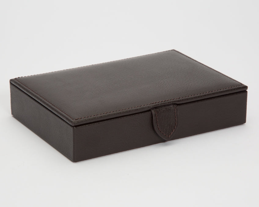 Wolf Cufflink Tie Box Blake Brown 305306. The Blake cufflink box, in brown pebble leather, incorporates a classic gentleman travel necessity with a bit of flair. Includes brown ultrasuede lining, snap closure, 10 cufflink compartments and 1 collar stay compartment.