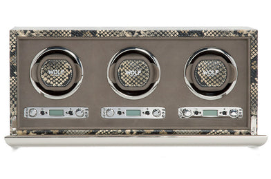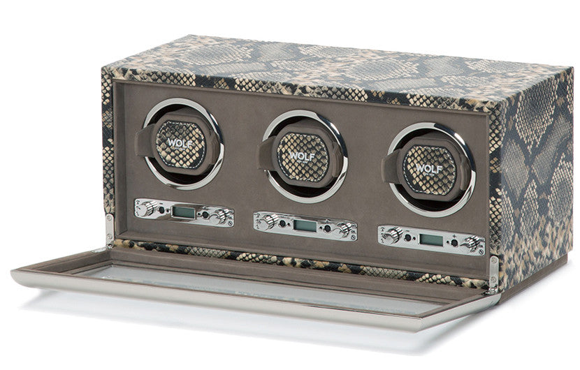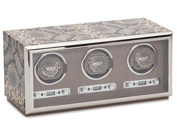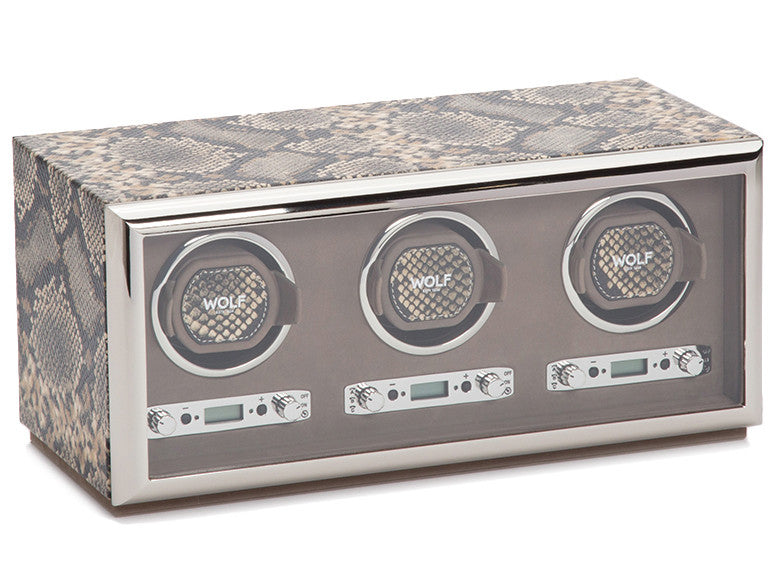 Show off your wild side with this unmissable WOLF Exotic Triple Winder, meticulously handcrafted from tan python-embossed top grain leather. This stunning WOLF Triple Watch Winder embodies an elegance and ferocity that you’ll struggle to find anywhere else. Its sleek chrome plated door and mink nubuck leather interior is stunning and includes a watch cuff designed for watches as big as 52mm.