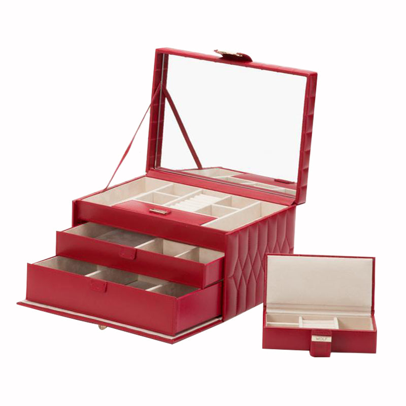 WOLF Jewellery Box Caroline Medium Red 329772. The Caroline is a signature WOLF jewellery case, defined by its distinctive quilted exterior and classic shape. Includes quilted red leather, leather tassel keyring, anti tarnish LustreLoc lining, gold finished lock, glass mirror, 15 compartments, 7 ring rolls and travel case with 3 compartments and 4 ring rolls.