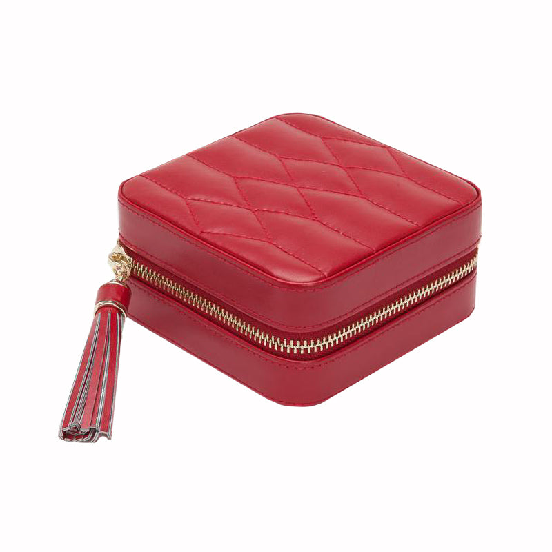 WOLF Jewellery Case Caroline Zip Travel Red 329972. The Caroline is a signature WOLF jewellery case, defined by its distinctive quilted exterior and classic shape. Includes quilted leather, LusterLoc lining, zip lock closure, leather tassel, glass mirror, 7 ring rolls, 4 compartments and 3 necklace hooks with pocket.