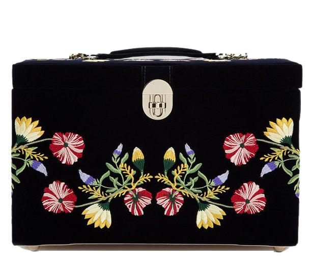 The Zoe Medium Jewellery Box is sophisticated yet playful with velvet, soft curves, and rounded pale gold hardware. Includes velvet exterior, LusterLoc interior, 10 small compartments, 4 medium compartments, 3 large compartments, 4 bracelet compartments, 4 bracele watch cuffs, and removable mini travel piece.