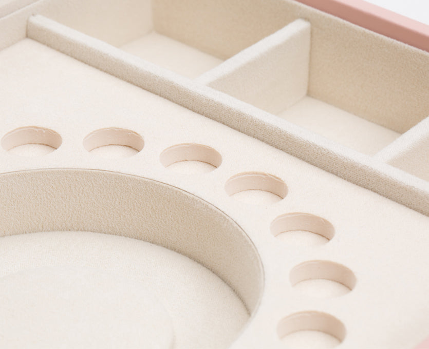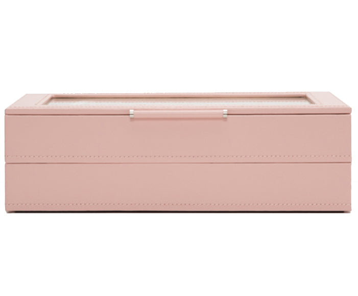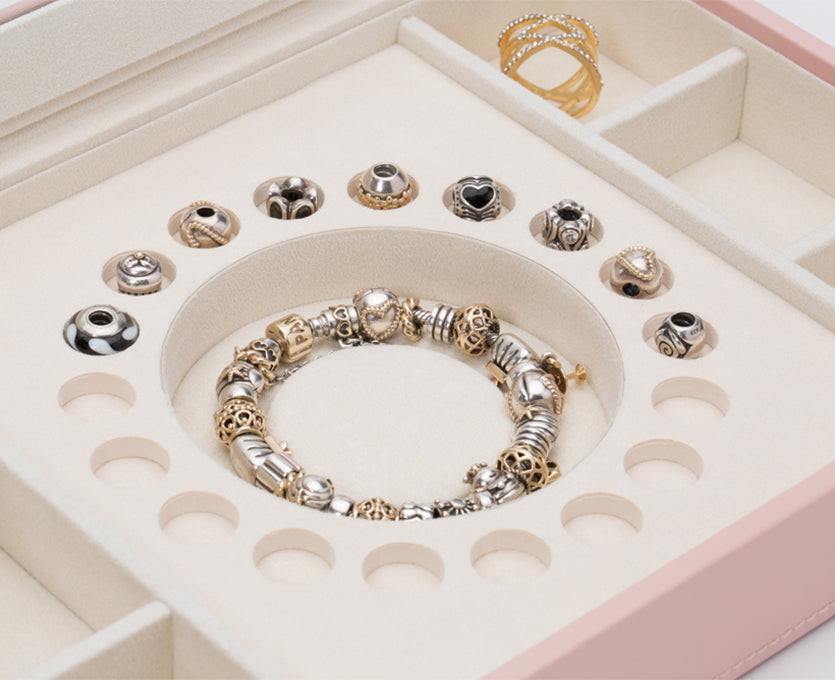 Wolf Stackable Tray Sophia Rose Quartz 392115. Charming and sophisticated, Sophias Stackable Trays are designed for the ultimate charm and charm bracelet storage. Covered in a supple leather exterior and lined with the patented LusterLoc anti tarnish lining, the clean lines and protective features make this set the perfect solution for Pandora, Thomas Sabo, and other charm and jewellery safekeeping. Included are 18 round charm storage spaces, a bracelet well, 2 long necklace compartments, 8 ring rolls and 4 additional square compartments for extra storage.