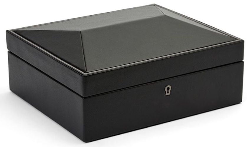 WOLF Watch Box British Racing Black 8pc 792602. Classics are not created, they are born, destined to be one-off’s, different, unique and above all else, timeless. British Racing has, in a very short span of time, become a classic, truly one of a kind. Protect your watches in style in our 8 piece watch box with storage.