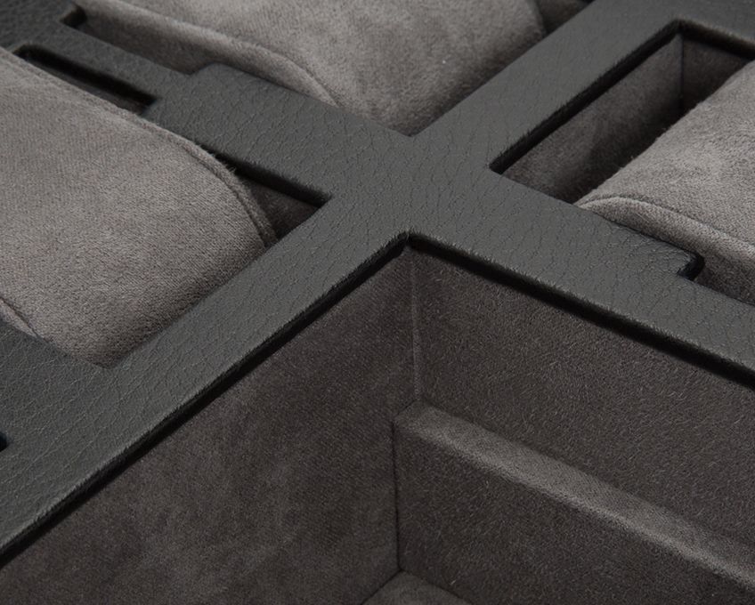 WOLF Watch Box Howard Black 465203. Stylish and functional, the Howard collection matches todays man with his needs, loves and passions. The Howard watch box with pebble leather includes compartment for cufflinks and 7 watch compartments, chrome hardware, ultrasuede interior and a locking glass cover adding a level of elegance and sophistication.