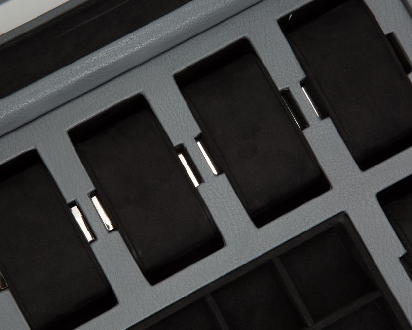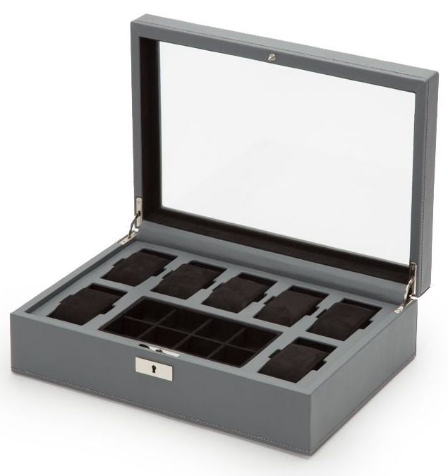 WOLF Watch Box Howard Grey 465265. Stylish and functional, the Howard collection matches todays man with his needs, loves and passions. The Howard watch box with pebble leather includes compartment for cufflinks and 7 watch compartments, chrome hardware, ultrasuede interior and a locking glass cover adding a level of elegance and sophistication.