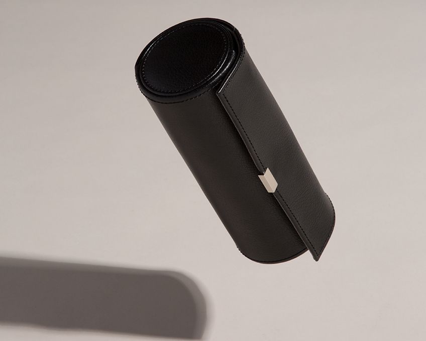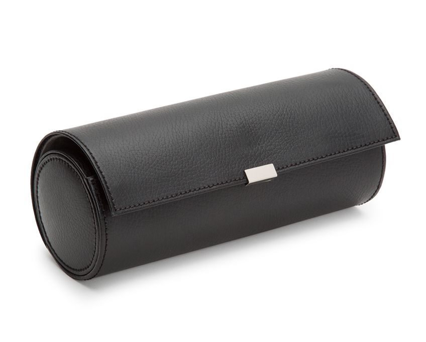 Wolf Watch Roll Howard Triple Black 465903. Stylish and functional, the Howard collection matches todays man with his needs, loves and passions. The Howard triple watch roll combines the finest leathers with over five generations of handmade tradition. Securely pack three timepieces and be prepared for any occasion thrown your way. Includes chrome finished hardware with snap closure, two Watch Guards and ultrasuede interior. When you travel with a WOLF Watch Roll, you are traveling with tradition.