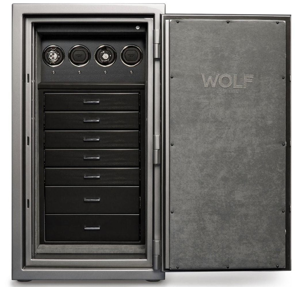 WOLF Watch Safe Atlas 4 Piece Titanium 490465. The ultimate in security for your watches, jewellery & valuables. Forged in American steel, UL tested and certified for burglary & fire, the Atlas is an impenetrable fortress. Painted steel polished to a mirror finish, drawers lined with LusterLoc treated fabrics that stop tarnishing for 35 years. Watch winders are controlled by WOLF’s Bluetooth connected App. Control one or all winders at the same time.