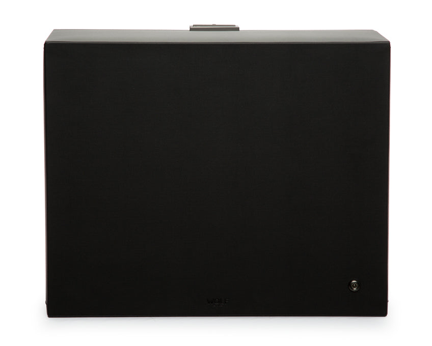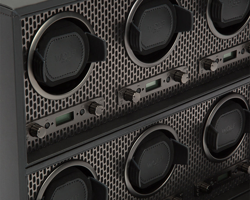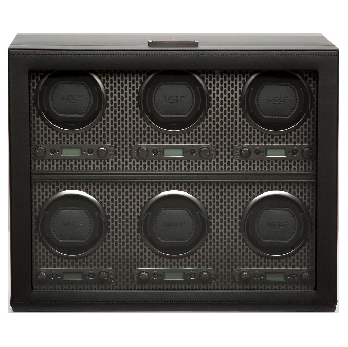 WOLF Watch Winder Axis 6 Piece Powder Coat 469603. This meticulously engineered watch winder with fresh design and patented technology ensures your watch is protected for a lifetime. Features custom black powder coat plating, micro suede interior, locking glass cover, backlit LCD display, black powder coat finished hardware and 6 winding modules.