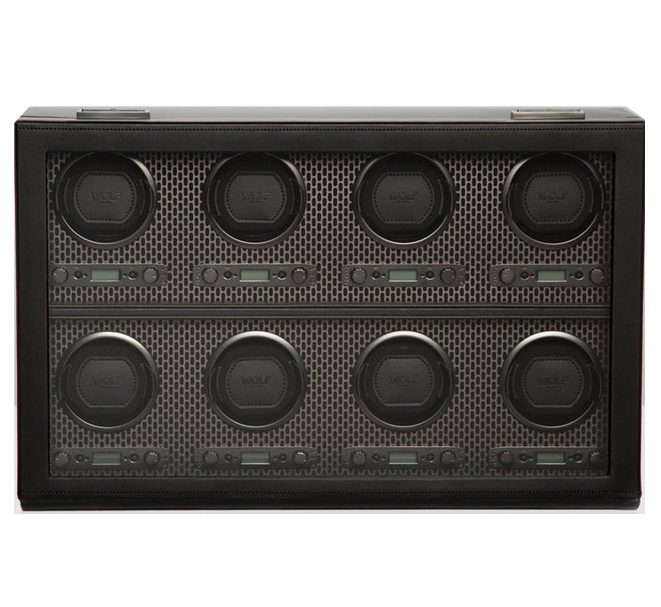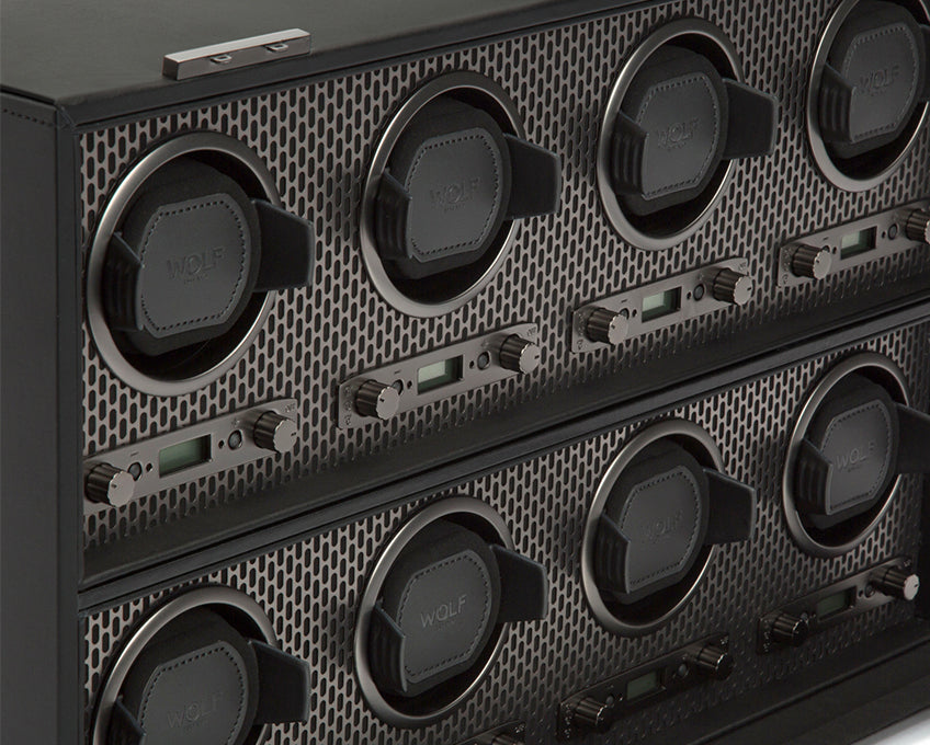 WOLF Watch Winder Axis 8 Piece Powder Coat 469703. Powerful, sleek, sophisticated. Axis is as intricate as its timepieces inside. A single watch is made up of many rotating axes, working in perfect unison to tell time. The power of an Axis and the collection combines this precision and WOLFs sleek design, making Axis the only watch winder you’ll need. It includes custom metal plating in a stunning black powder finish, locking glass cover, backlit LCD display, matte chrome finished hardware and 8 winding modules. Combined with trusted patented technology ensures your watches are protected and displayed in style.