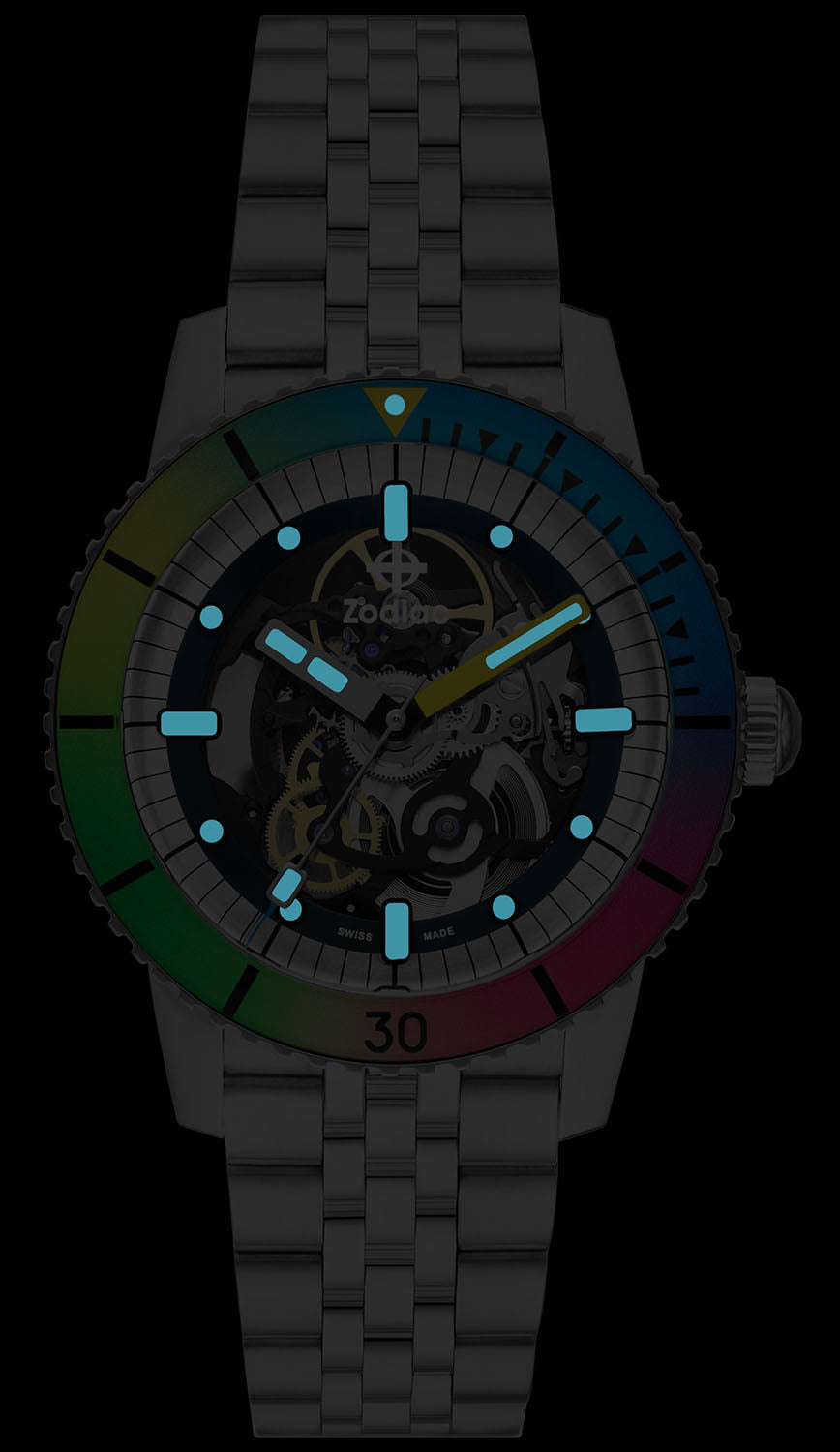 Zodiac Watch Super Sea Wolf Skeleton 6-15 Limited Edition ZO9298. For 140 years, Zodiac has dedicated itself to the precision and craftsmanship associated with Swiss timekeeping. In that time, we’ve challenged boundaries, pushed the limits of design, and innovated to create highly technical, dynamic timepieces, all while staying true to our rebellious spirit and heritage. Never has our passion for innovation and breaking the norms been more evident than with our newest iteration of the Super Sea Wolf Compression – Skeleton.