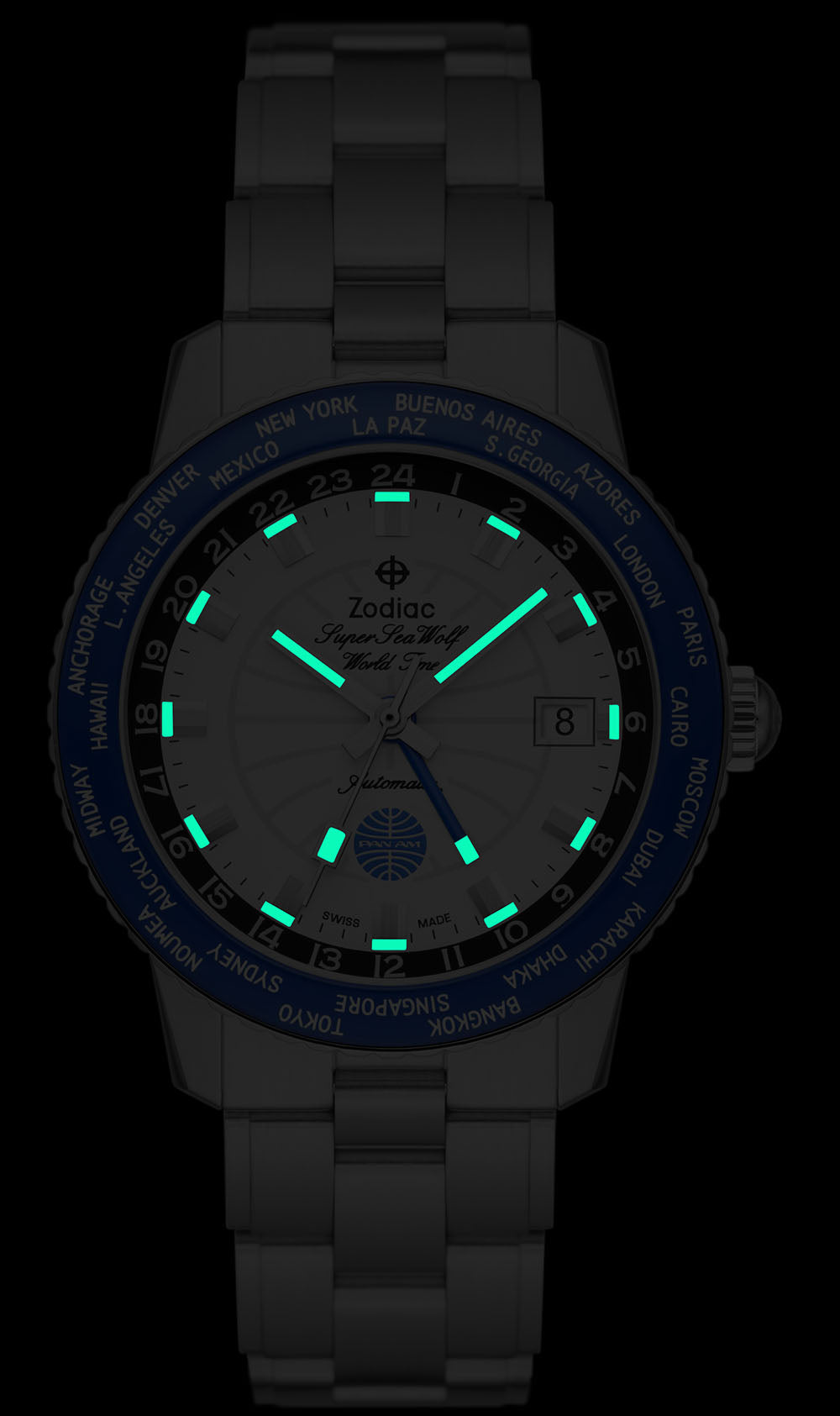 Zodiac Watch Super Sea Wolf World Time GMT Pan Am ZO9412. A special world-time watch that celebrates the most famous Jet Age airline of them all – Pan Am. Housed in a 40mm stainless steel case, the Super Sea Wolf GMT PanAm measures 13.6mm tall – not bad, considering its automatic, four-hand Swiss Soprod C125 movement. A detailed mix of brushed and polished surfaces conveys a sense of sophistication to the case design, which is joined by matching steel, three-link Oyster-style bracelet (if you took but a quick glance at said bracelet, you’d be forgiven for confusing it with a vintage stretch-rivet model from the mid-20th century!) Fitted to the case is an attractive blue world time bezel with 24 cities, allowing the user to track multiple time zones at once in concert with the dial’s fourth GMT hand.